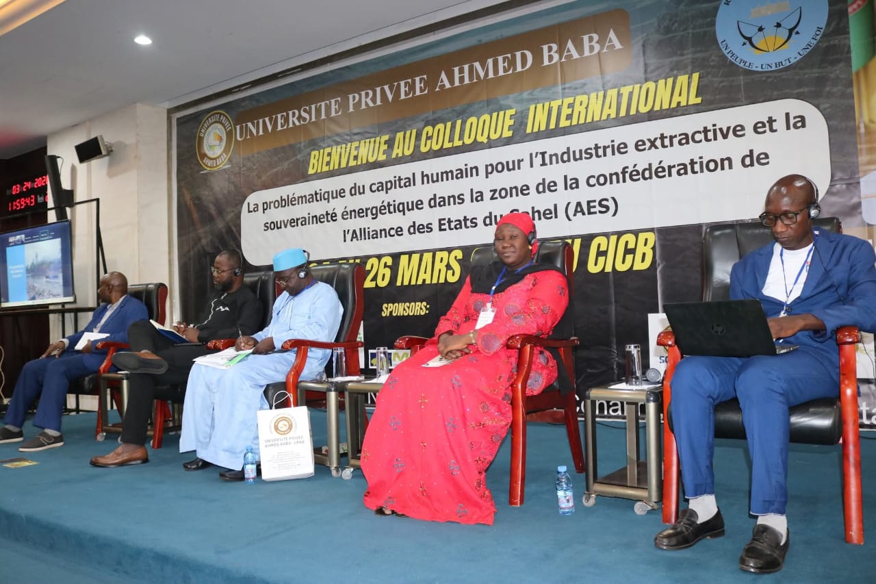Bamako a abrité du 24 au 26 mars 2026, un colloque international autour du thème :« 𝑳𝒂 𝒑𝒓𝒐𝒃𝒍𝒆́𝒎𝒂𝒕𝒊𝒒𝒖𝒆 𝒅𝒖 𝒄𝒂𝒑𝒊𝒕𝒂𝒍 𝒉𝒖𝒎𝒂𝒊𝒏 𝒑𝒐𝒖𝒓 𝒍’𝒊𝒏𝒅𝒖𝒔𝒕𝒓𝒊𝒆 𝒆𝒙𝒕𝒓𝒂𝒄𝒕𝒊𝒗𝒆 𝒆𝒕 𝒍𝒂 𝒔𝒐𝒖𝒗𝒆𝒓𝒂𝒊𝒏𝒆𝒕𝒆́ 𝒆́𝒏𝒆𝒓𝒈𝒆́𝒕𝒊𝒒𝒖𝒆 𝒅𝒂𝒏𝒔 𝒍𝒂 𝒛𝒐𝒏𝒆 𝒅𝒆 𝒍𝒂 𝑪𝒐𝒏𝒇𝒆́𝒅𝒆́𝒓𝒂𝒕𝒊𝒐𝒏 𝒅𝒆 𝒍’𝑨𝒍𝒍𝒊𝒂𝒏𝒄𝒆 𝒅𝒆𝒔 𝑬́𝒕𝒂𝒕𝒔 𝒅𝒖 𝑺𝒂𝒉𝒆𝒍 (𝑨𝑬𝑺) ». Organisé par l’Université Privée Ahmed Baba, c’est le Centre International de Conférence de Bamako (CICB) qui a servi de cadre à cet événement. L’ouverture des travaux du forum était présidée par le chef de cabinet du Ministère des mines, M. Yacouba KEBE, en présence du Président Directeur Général de l’université, M. Ousmane DRAMÉ et ainsi que des experts du secteur minier, des décideurs politiques et des étudiants.